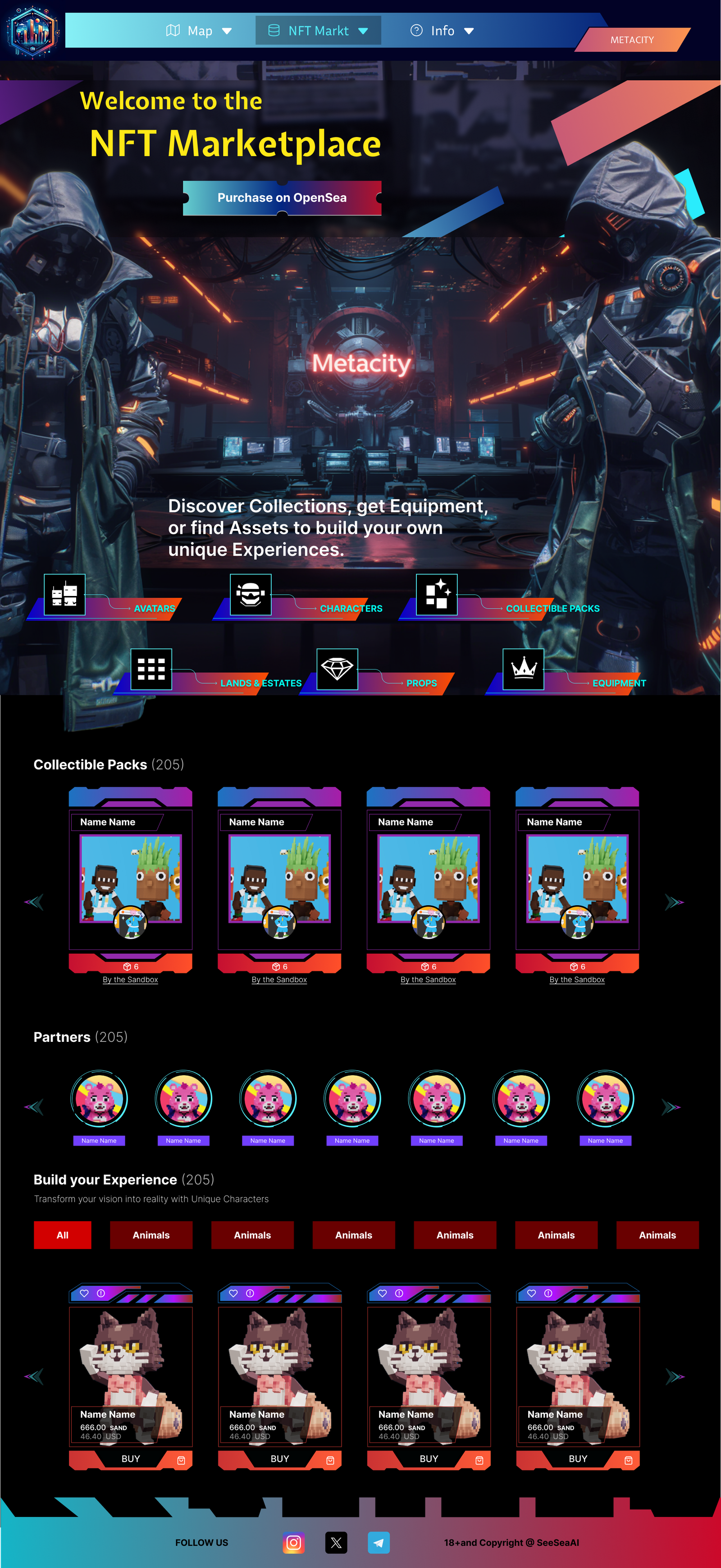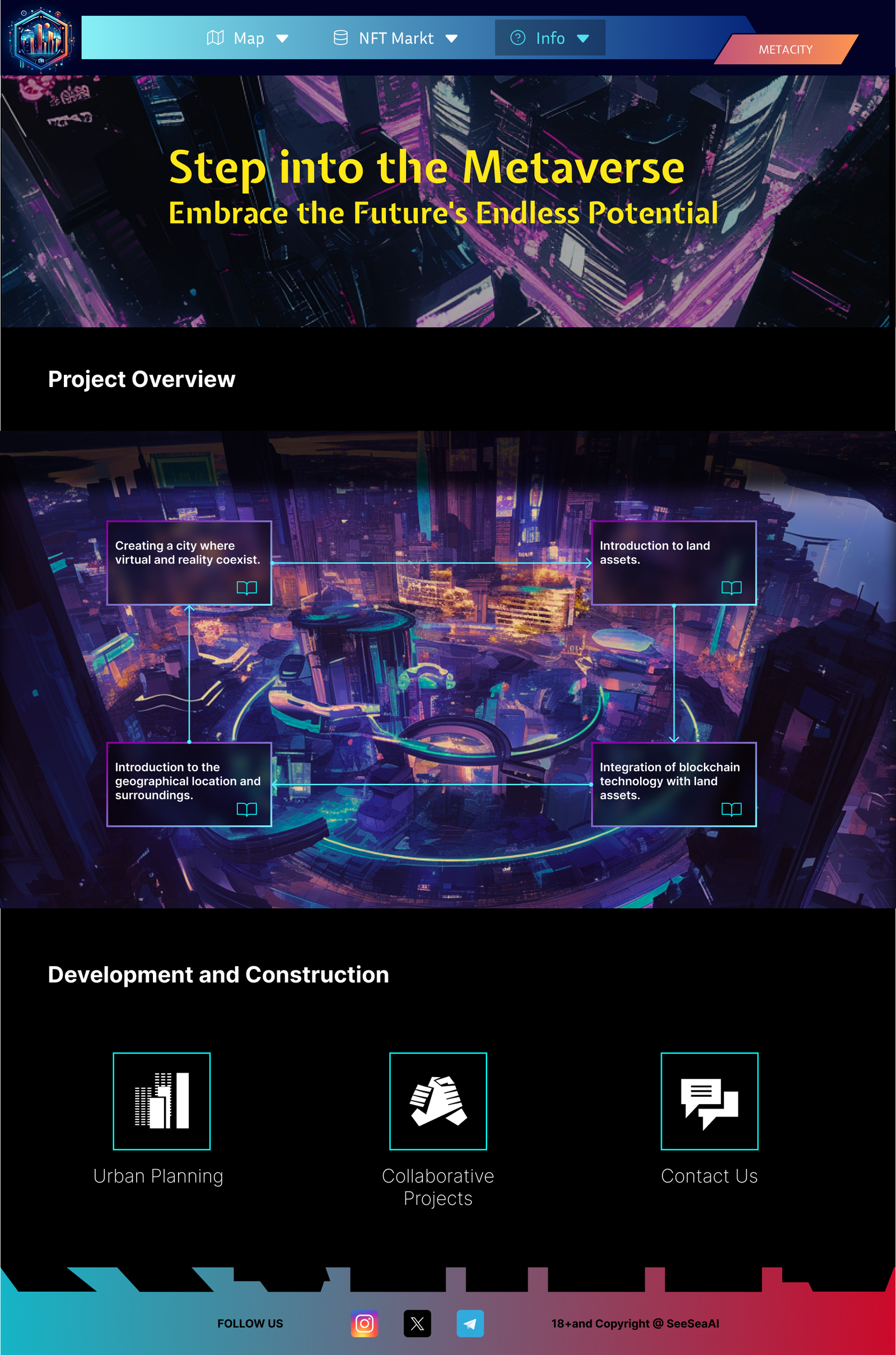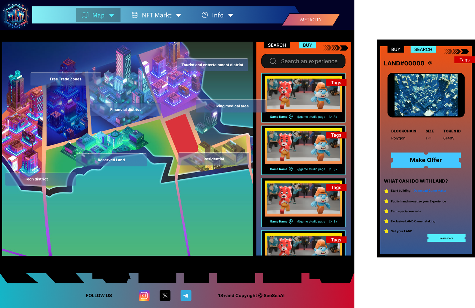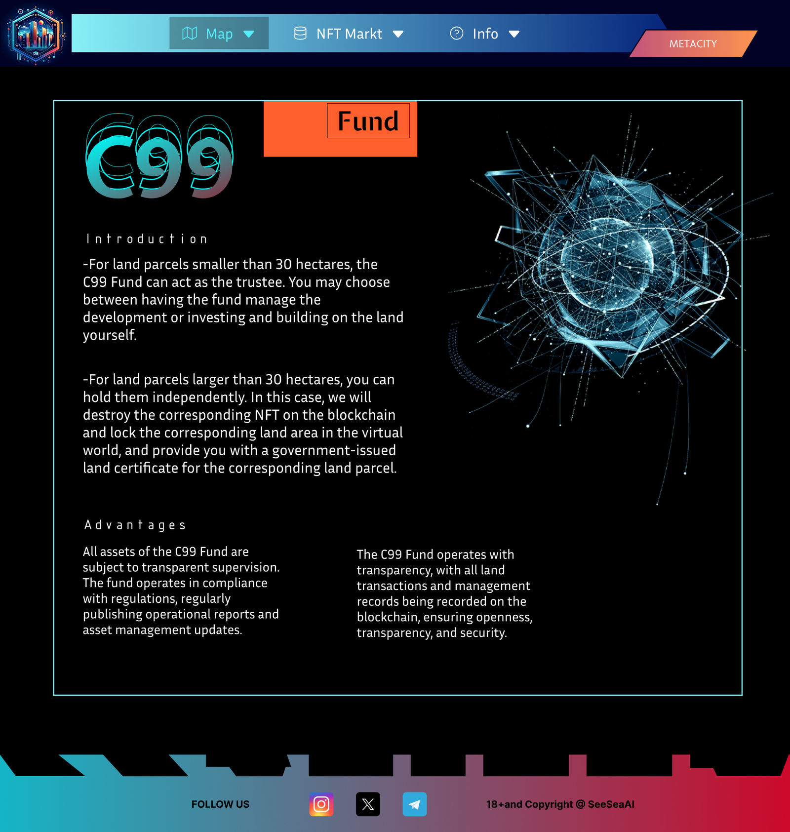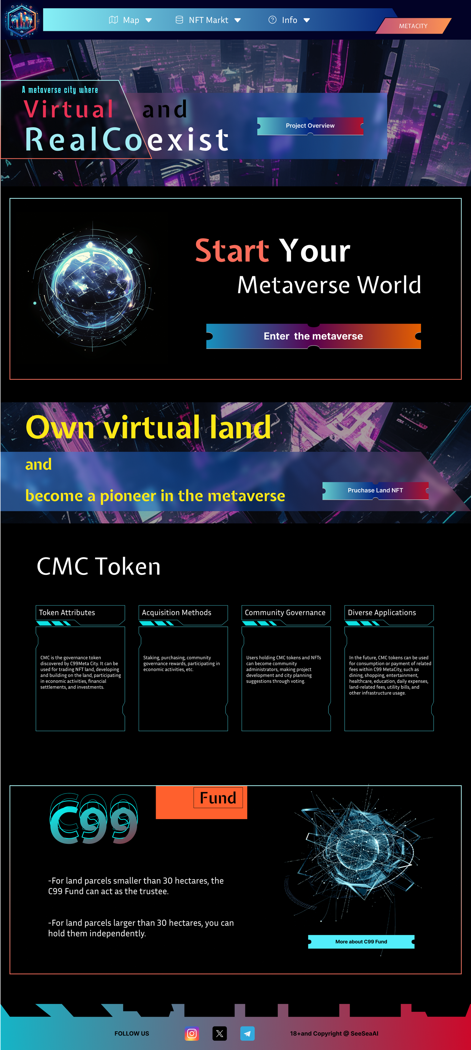 I designed the UX and visual style for the whole site. I built the information structure, created the main page layouts, and designed key graphics for the homepage, land map, NFT marketplace, C99 Fund, and CMC token sections.