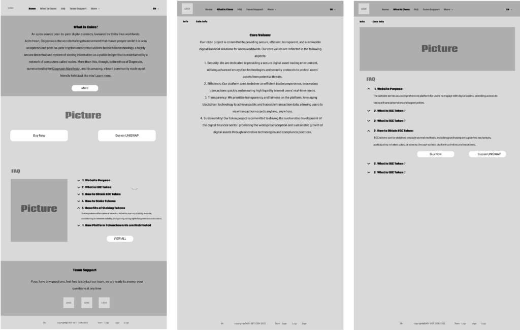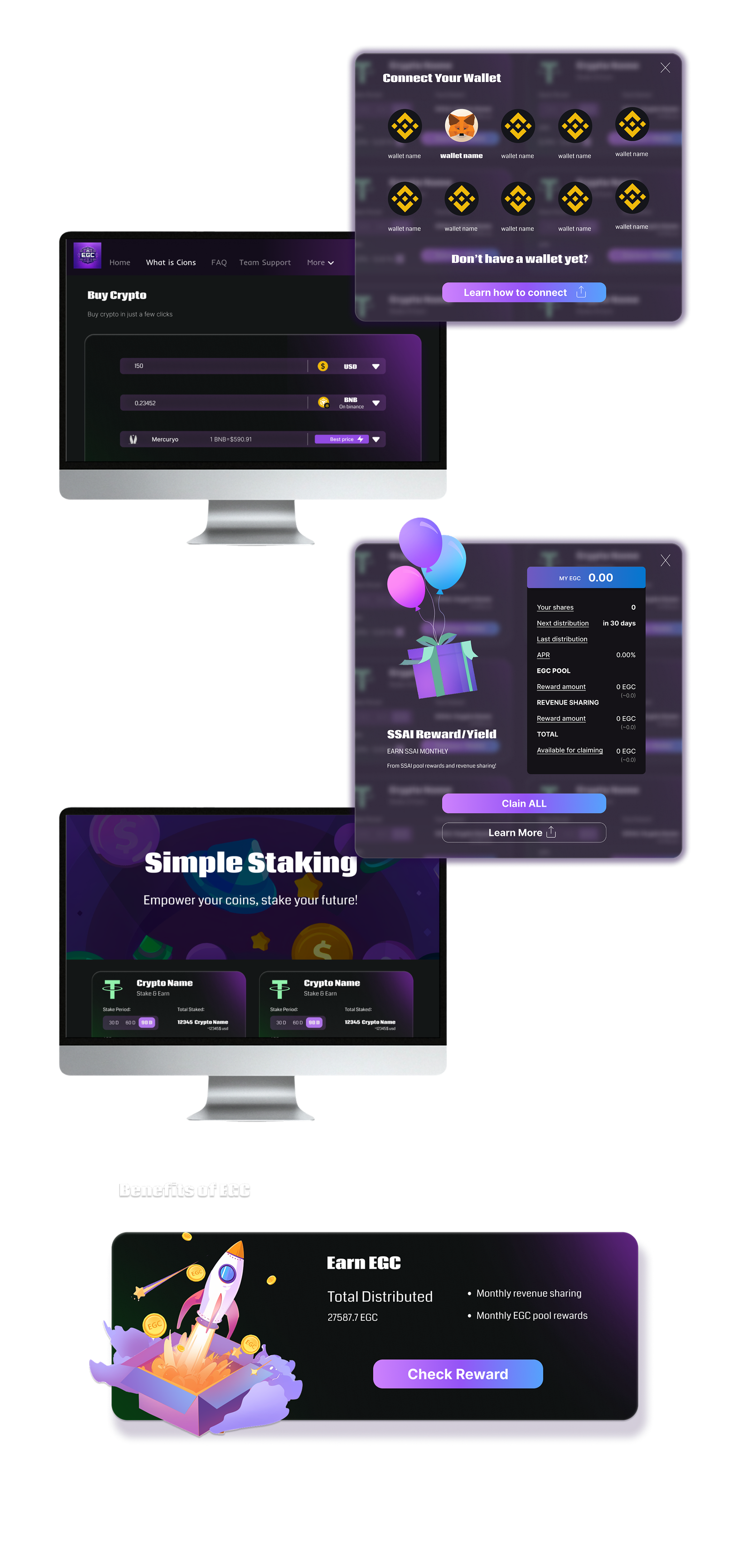 EGC Token Staking Platform is a web and mobile interface for staking a utility token in a Web3 ecosystem. Based on the client’s functional mind map, I designed the complete UX/UI structure, including token introduction, staking flow, FAQ, and reward display, and turned it into a clear, product-ready interface.