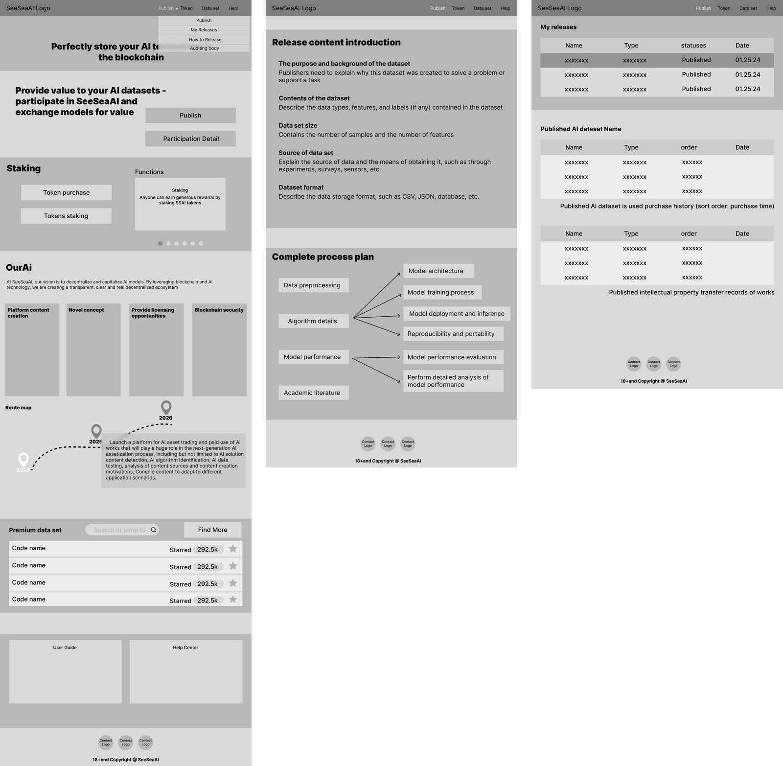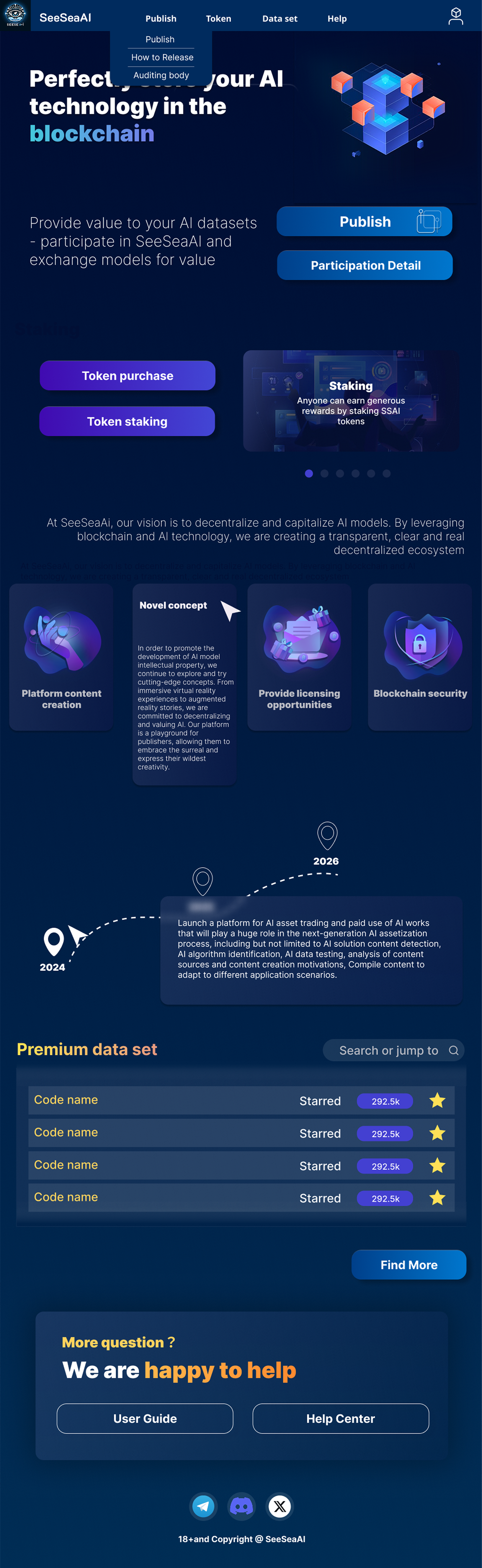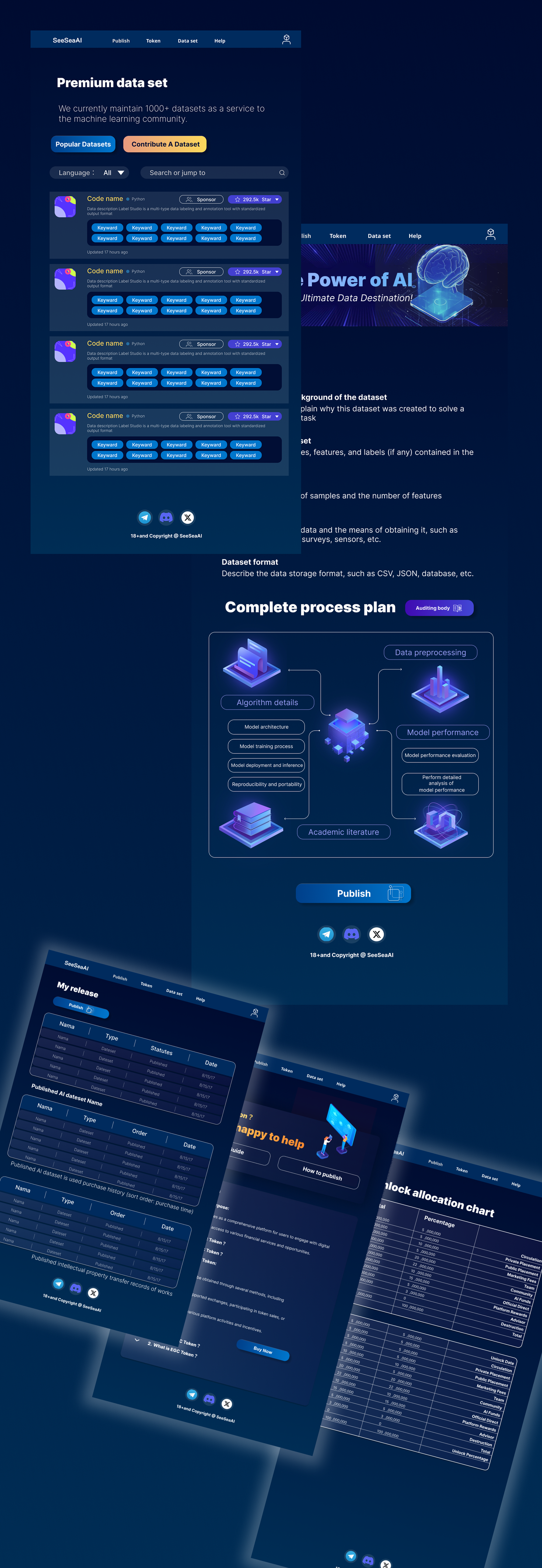 SSAI AI Dataset Platform is a web interface for publishing and monetizing AI datasets on the blockchain. Starting from the client’s functional mind map, I designed the official platform website and core product flows, including dataset publishing, premium dataset listing, staking, wallet, and help center. The goal was to turn a very technical concept into a clear, easy-to-understand product for both data providers and buyers.