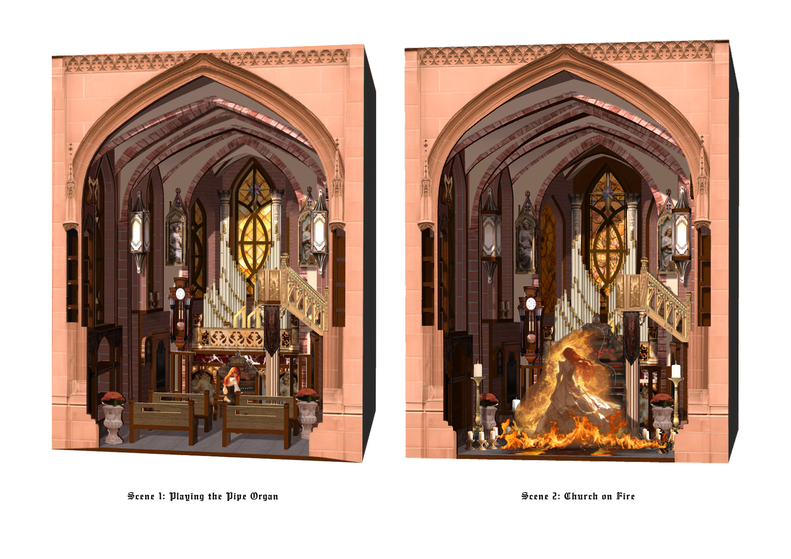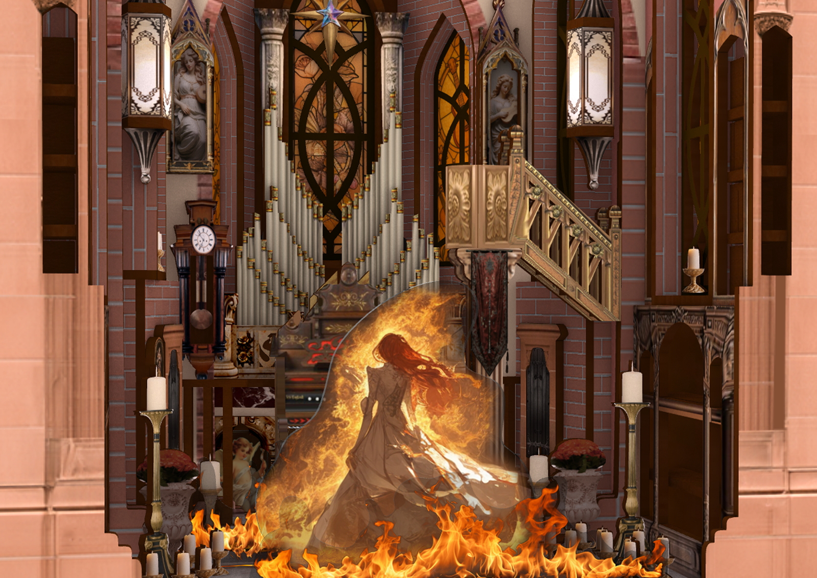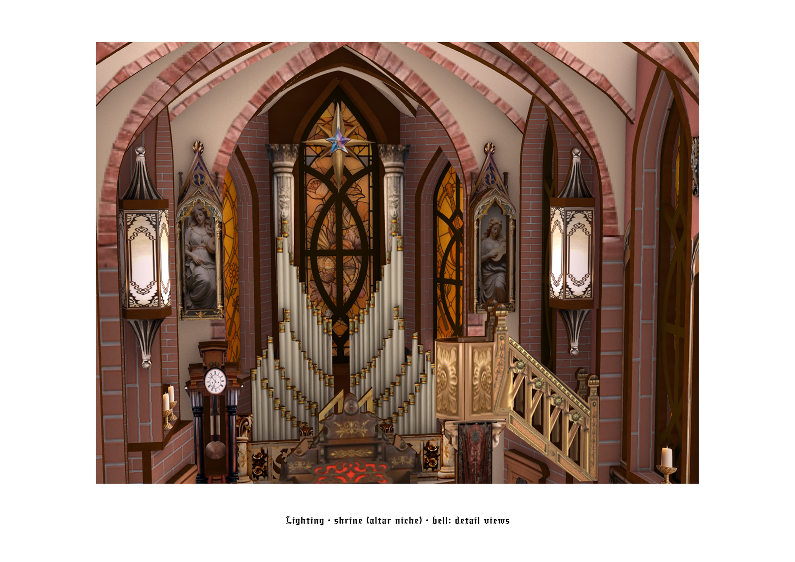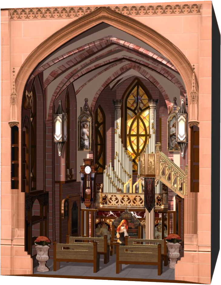 The visual focal point is a monumental pipe organ at the far end. Its vertical ranks echo the rhythm of the ribs, anchoring the composition and imparting a calm, solemn mood. Using flat wooden sheets to suggest masonry logic was a challenge; in manufacturing, repeated cuts allow thin boards to bend into vaults. The interior also employs forced perspective (larger front, smaller back) to heighten vertical grandeur within a compact footprint.